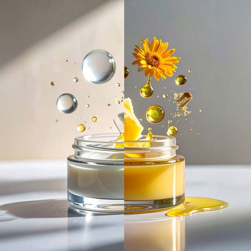 Zo ontstond het uitgangspunt dat alles veranderde: geen water meer in huidverzorging. Door het water weg te laten, verdwijnt de noodzaak voor conservering, verdunners en parfums. Wat overblijft, zijn de pure bouwstenen van voeding: boters, oliën en CO₂-extracten.