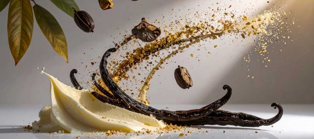 Vanille Bourbon CO₂ (Vanilla planifolia) geeft een zachte, comfortabele geur en werkt licht antioxidatief. Ze verzacht de huid en brengt warmte in de formule.